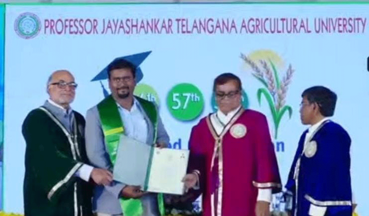 The degree was handed over to him at the 56th Convocation of Professor Jayashankar Telangana Agricultural University held at Rajendranagar in Hyderabad on Monday. His research focused on management practices to reduce excess phosphorus in the soils of the North Telangana zone and on cultivating maize and groundnut crops on raised beds using bed planters.