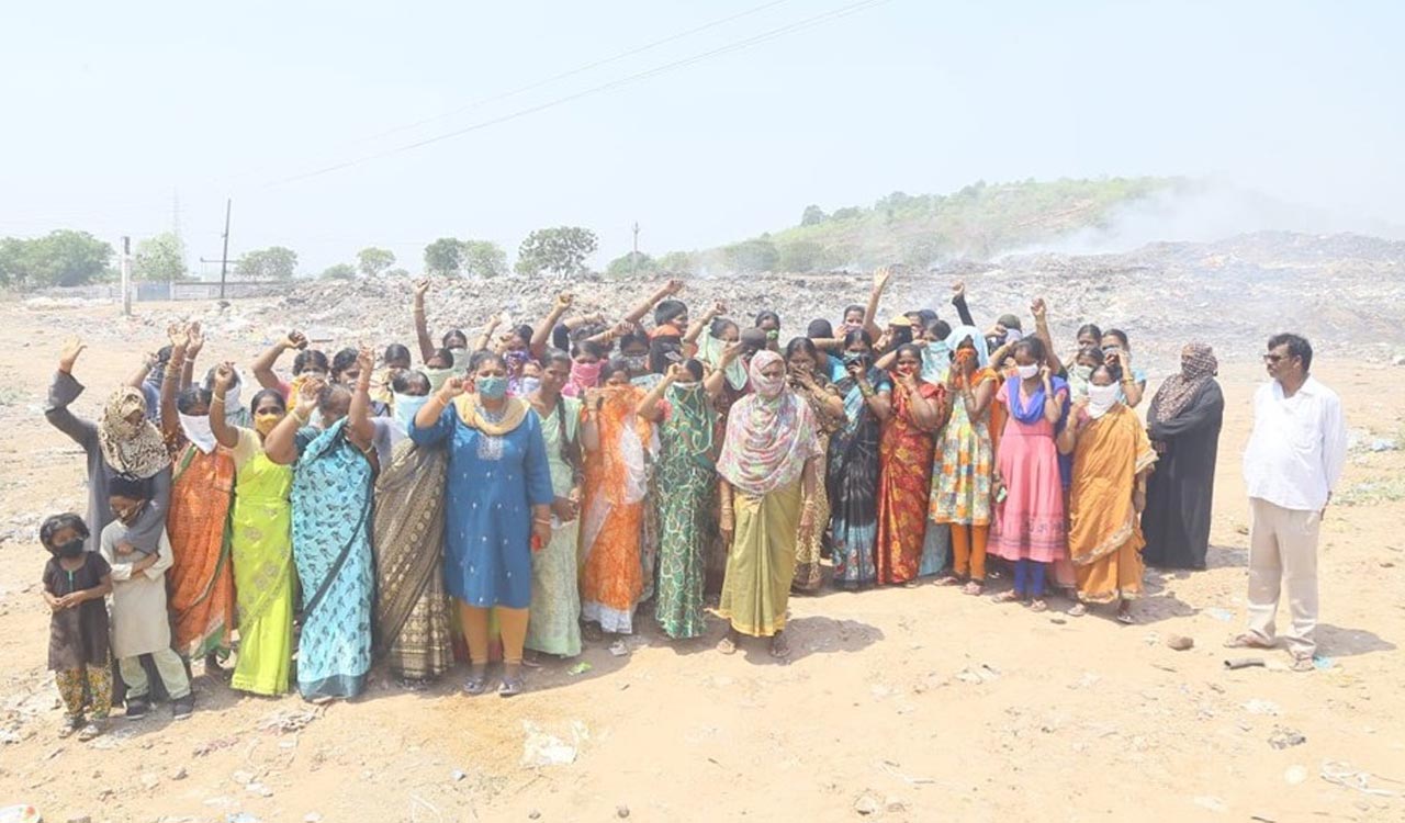 Residents of Andalamma, Green City and nearby colonies in Mancherial are facing severe health problems due to toxic smoke from burning waste at a municipal dry resource collection centre. Despite repeated complaints, the issue has persisted for nearly two decades.