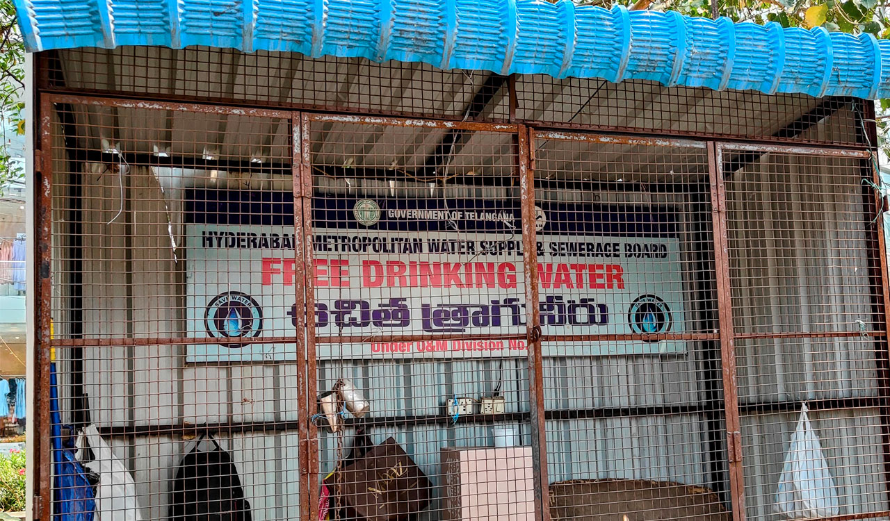 Several water kiosks set up by the Hyderabad Metropolitan Water Supply and Sewerage Board to provide free drinking water during summer are lying defunct across the city, with some being used as storage spaces by sanitation workers due to lack of maintenance.