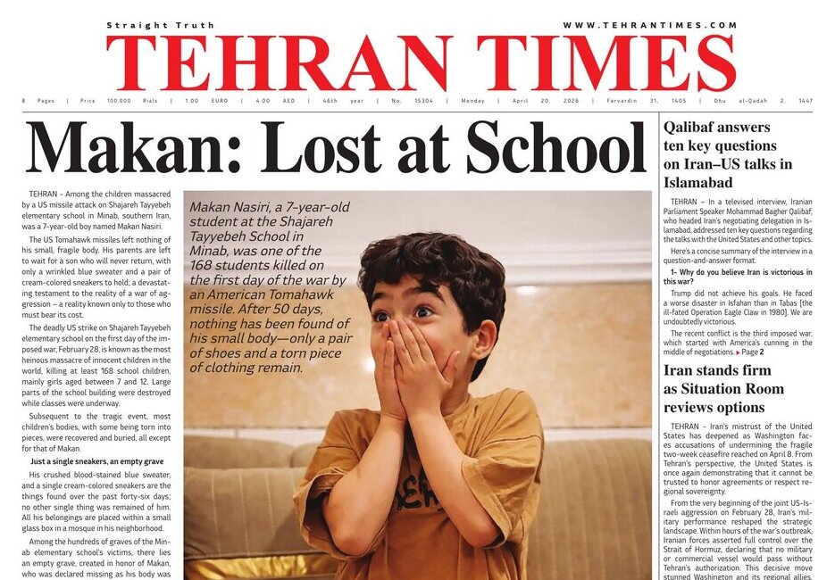 TEHRAN, Apr. 19 (MNA) – Here are the front pages of Iran’s English dailies on Monday, April 20.