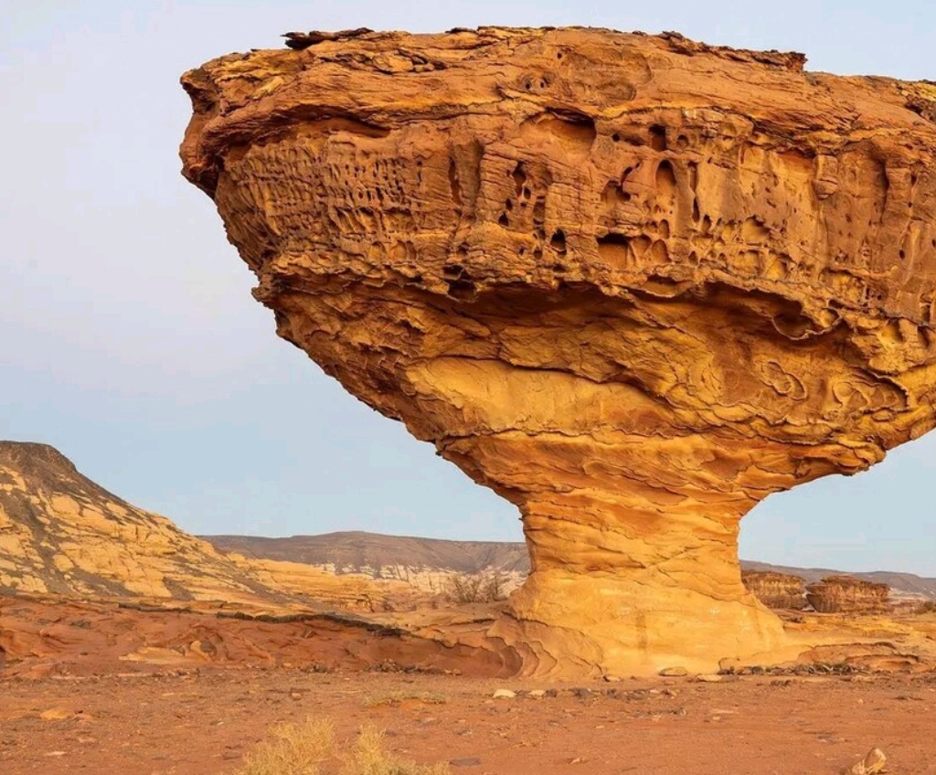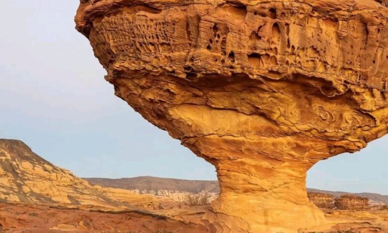 سعودی خبررساں ایجنسی “ایس پی اے” کے مطابق تبوک ریجن بھی ایسے ہی قدرتی شاہکاروں سے بھرے پڑے ہیں۔ ہزاروں برس سے ارضیاتی تبدیلیوں نے ایک چٹان کو ایسے شاہکار میں تبدیل کر دیا کہ اسے دیکھ کر فطرت کی فنکاری پر عقل دنگ رہ جاتی ہے۔ علاقے میں ایک چٹان ایسے کھڑی ہے جسے دیکھ کر گمان ہوتا ہے کہ کوئی بڑی میز ہے جسے ایک پائے پر کھڑا کر دیا گیا ہے۔ ہزاروں برس سے ہوا کے ٹکرؤ سے چٹان نے جو شکل اختیار کی وہ انتہائی منفرد ہے۔