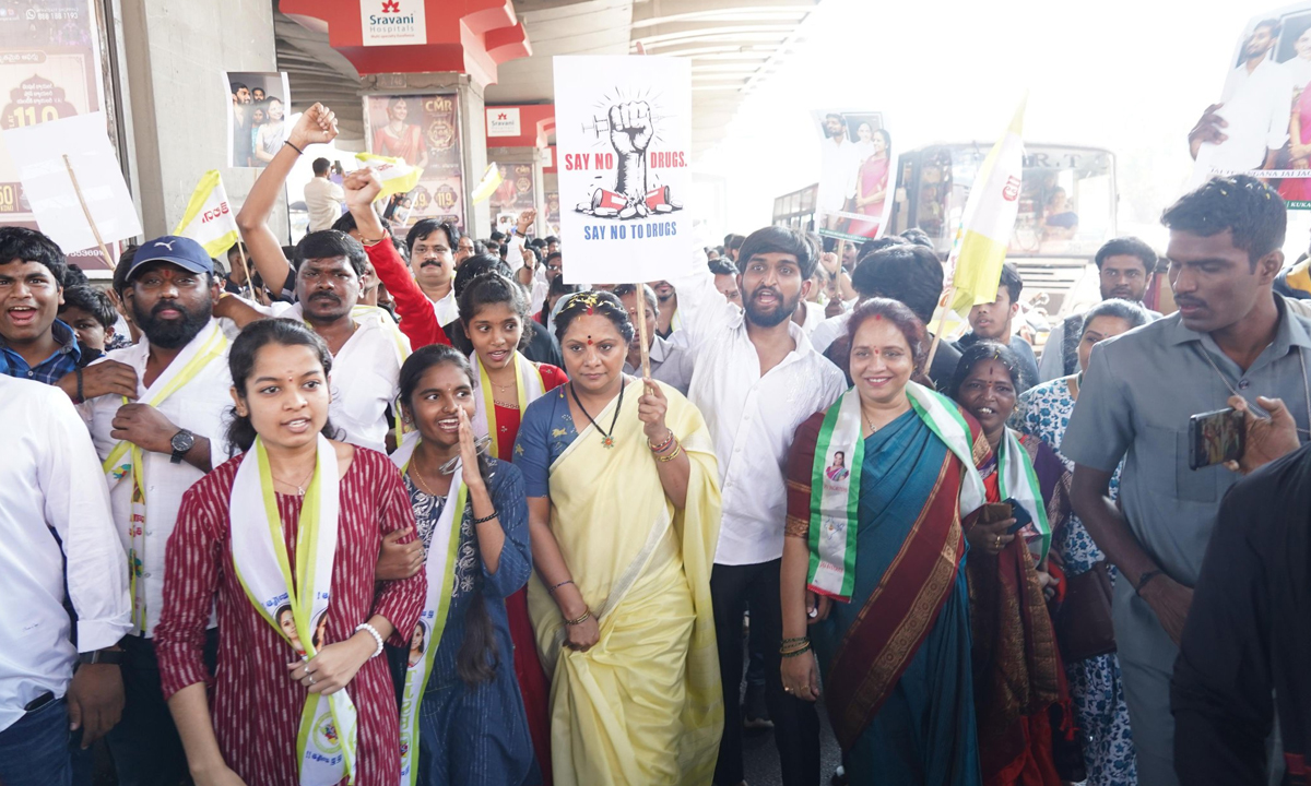 بعد ازاں کویتا نے قومی شاہراہ پر منعقدہ ایک بڑی ریلی میں شرکت کی، جس میں طلبہ نے سرگرمی سے حصہ لیا۔ ریلی کے دوران نوجوان ’نو ٹو ڈرگس‘ اور ’نو ٹو بیٹنگ‘ جیسے پیغامات والے پلے کارڈز تھامے نظر آئے، جن کا مقصد شہری نوجوانوں میں منشیات اور آن لائن بیٹنگ کے بڑھتے رجحان کے خلاف شعور بیدار کرنا تھا۔