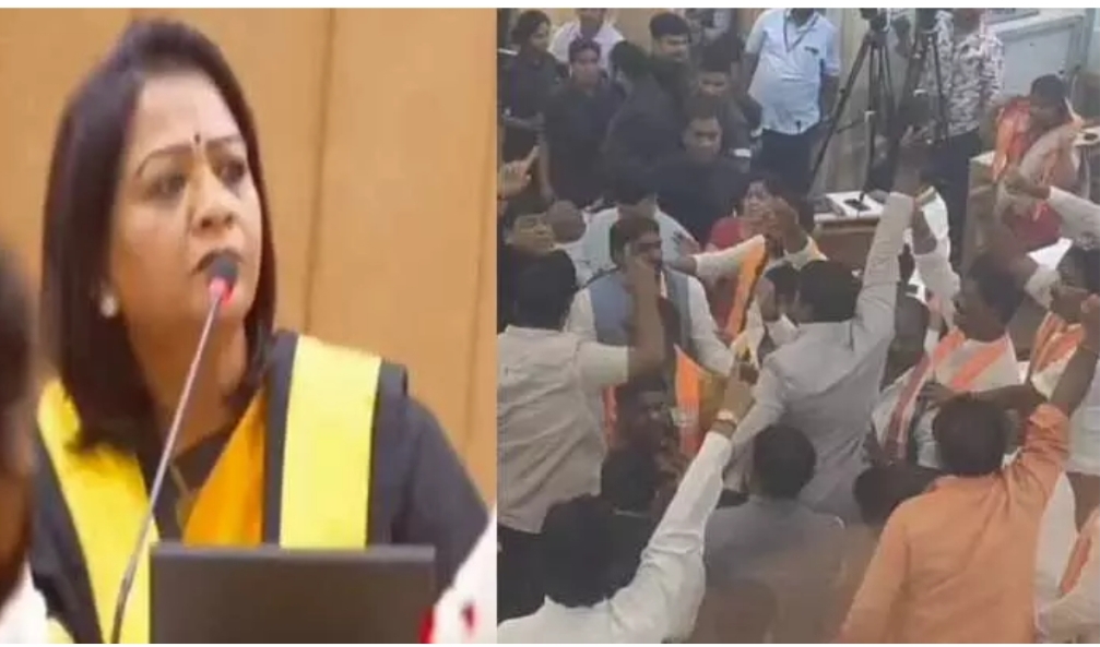 اسی دوران مجلس کے ارکان اپنی نشستوں سے نہ اٹھے جس پر بی جے پی ارکان نے سخت اعتراض کیا۔بعض بی جے پی کارپوریٹروں نے نعرے لگاتے ہوئے کہا کہ ’’وندے ماترم‘‘ گانے والوں کو ہی ملک میں رہنے کا حق ہے