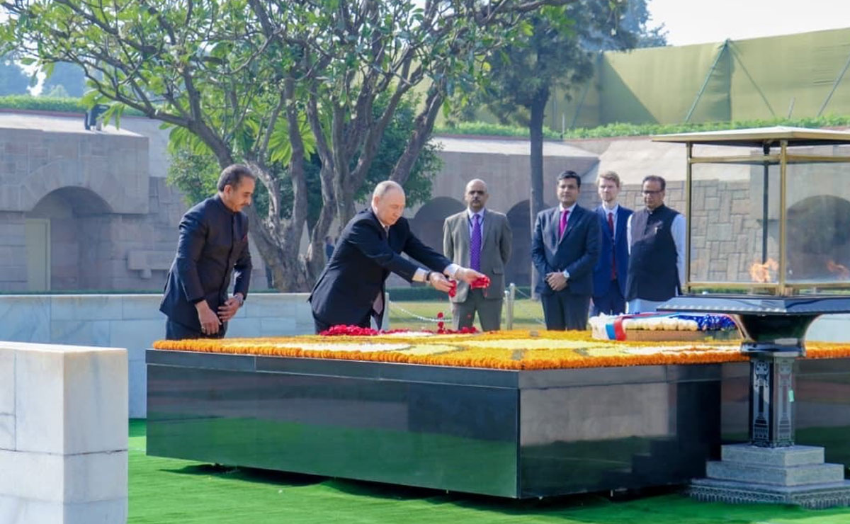 مسٹر پوتن نے مہاتما گاندھی کی سمادھی سر جھکایا اور پریکرما کی۔ انہوں نے پھولوں کی چادر چڑھائی اور باپو سے اظہار تشکر کیا۔ انہوں نے راج گھاٹ پر رکھے گئے ایک یادگار پر دستخط بھی کئے۔