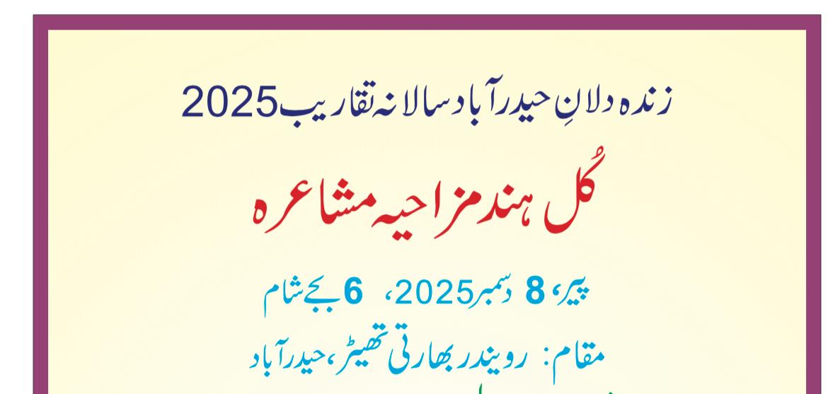زندہ دلان حیدرآباد سالانہ تقاریب 2025 کے ضمن میں پیر 8 دسمبر 2025 کو “کل ہند مزاحیہ مشاعرہ” کا انعقاد عمل میں آئے گا۔ تنظیم کی جاری تفصیل کے مطابق یہ مشاعرہ رویندر بھارتی تھیٹر حیدرآباد میں شام 6 بجے منعقد ہوگا۔ داخلہ عام رہے گا۔