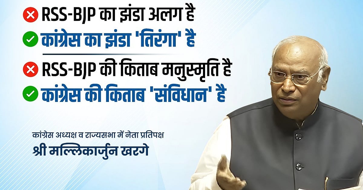 کانگریس صدر نے آزادیٔ ہند میں آر ایس ایس اور ہندو مہاسبھا کی عدم شرکت کا ذکر بھی اپنی تقریر میں کیا۔ انھوں نے کہا کہ ’’میں ایوان کو یاد دلانا چاہوں گا کہ ہندو مہاسبھا اور آر ایس ایس نے تحریک آزادی میں حصہ نہیں لیا تھا۔ یہی نہیں، انھوں نے ہندوستانی آئین کی کاپیاں بھی نذر آتش کر دی تھیں۔‘‘ وہ یہ بھی یاد دلاتے ہیں کہ ’’انھیں (آر ایس ایس اور ہندو مہاسبھا کو) اعتراض تھا کہ بابا صاحب نے جو آئین تیار کیا تھا، وہ منوسمرتی پر مبنی نہیں تھا، اس لیے آر ایس ایس کے لوگوں نے اسے منظوری نہیں دی۔ یہی نہیں، آر ایس ایس نے مہاتما گاندھی جی، پنڈت نہرو جی اور امبیڈکر جی کے پُتلے بھی رام لیلا میدان میں نذرِ آتش کیے۔ یہی آر ایس ایس-بی جے پی کی تاریخ ہے۔‘‘