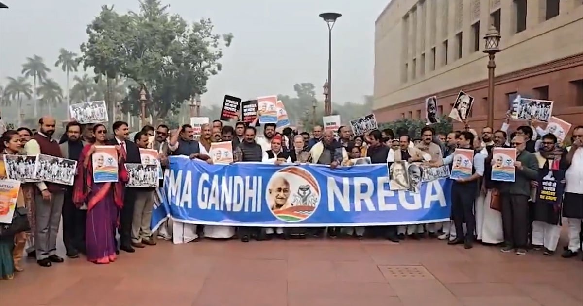 اپوزیشن اراکین نے ’مہاتما گاندھی نریگا‘ کی تختی اٹھائے پرِیرنا استھل میں گاندھی مجسمہ سے مکر دوار تک مارچ کیا اور حکومت کے خلاف نعرے لگائے۔ اس احتجاج میں کانگریس کی سینئر رہنما سونیا گاندھی، پرینکا گاندھی، کے سی وینوگوپال، ڈی ایم کے کی کنی موزی، ٹی آر بالو، اے راجہ، آئی یو ایم ایل کے ای ٹی محمد بشیر، شیو سینا (یو بی ٹی) کے اروند ساونت سمیت متعدد اپوزیشن رہنما شریک ہوئے۔