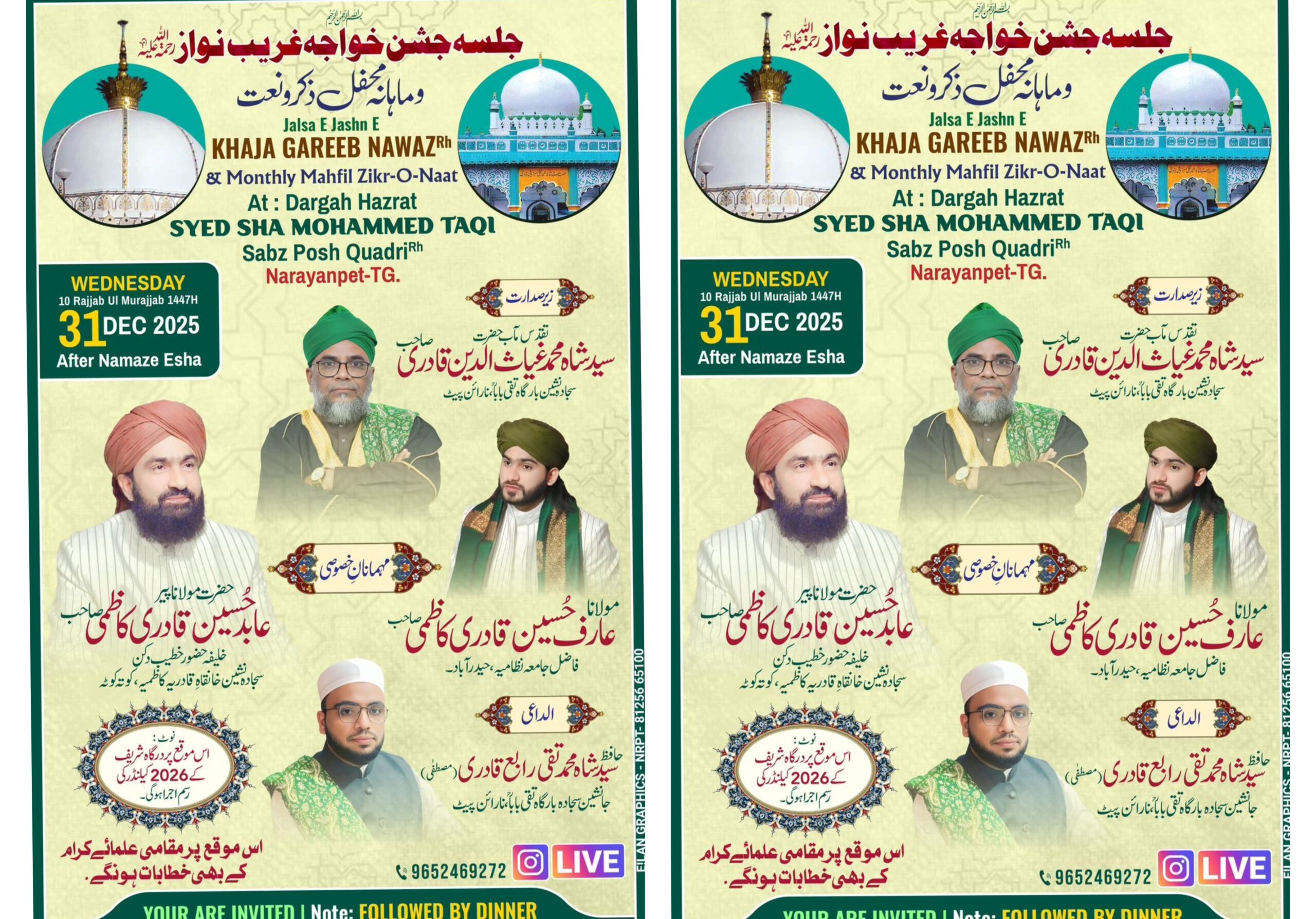 نارائن پیٹ : 30 دسمبر (اردو لیکس) نارائن پیٹ مستقر میں واقع درگاہ حضرت سید شاہ محمد تقی سبز پوش قادریؒ میں کل 31 دسمبر بروز چہارشنبہ بعد نماز عشاء جلسہ جشن خواجہ غریب نوازؒ و ماہانہ محفلِ ذکر و نعت کی تقریب منعقد ہوگی۔ جس کی صدارت تقدس مآب حضرت سید شاہ محمد غیاث الدین قادری سجادہ نشین بارگاہ تقی باباؒ انجام دیں گے۔