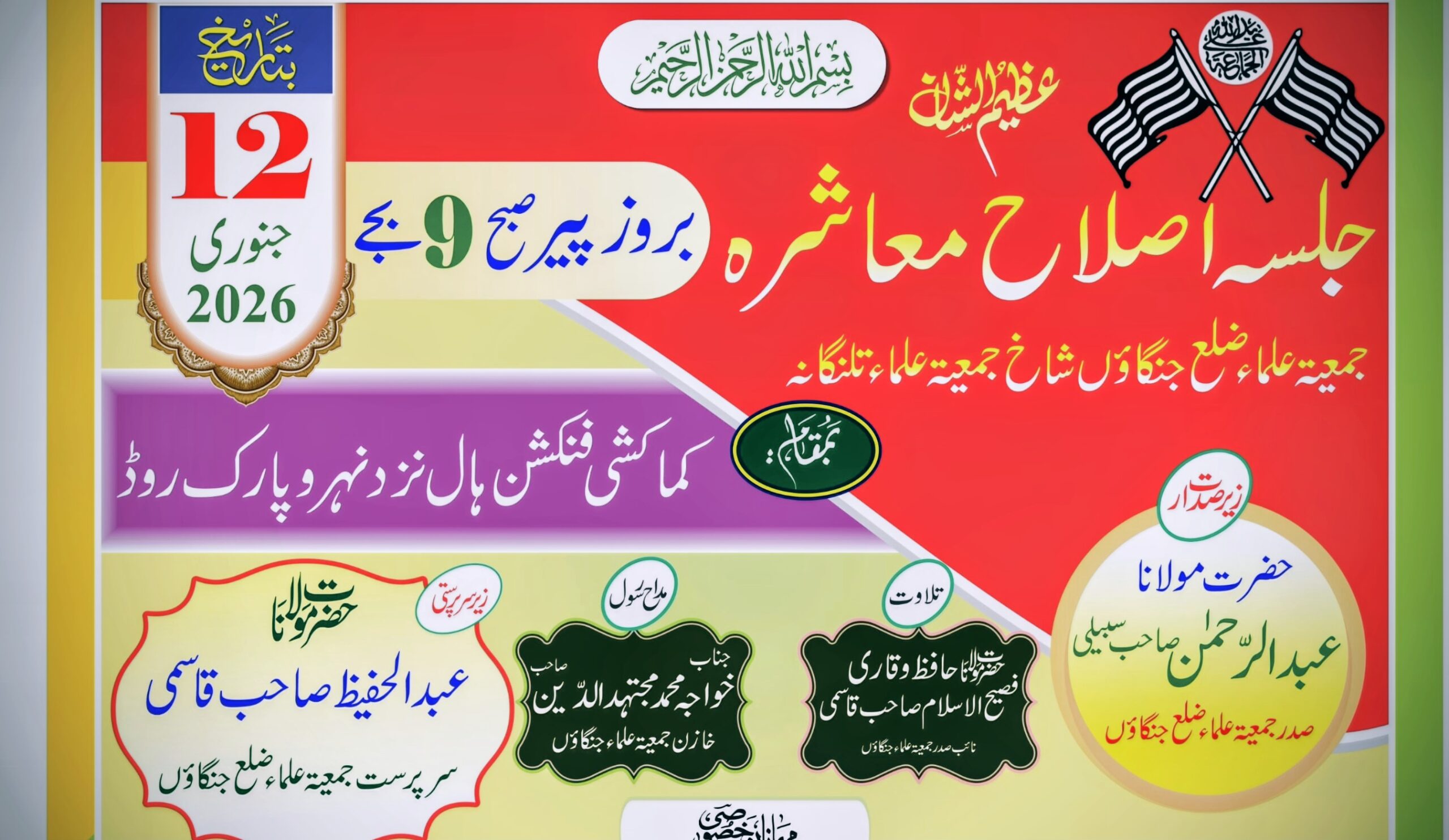 جنگاوں۔ محمد خواجہ مجتہد الدین ، ناظم شعبہ اصلاح معاشرہ جمعیت علماء ضلع جنگاؤں کے بموجب ایک عظیم الشان جلسۂ اصلاحِ معاشرہ بروز پیر، 12 جنوری 2026 کو صبح 9 بجے تا ظہر کماکشی فنکشن ہال، نزد نہروپارک جنگاؤں منعقد کیا جائے گا۔