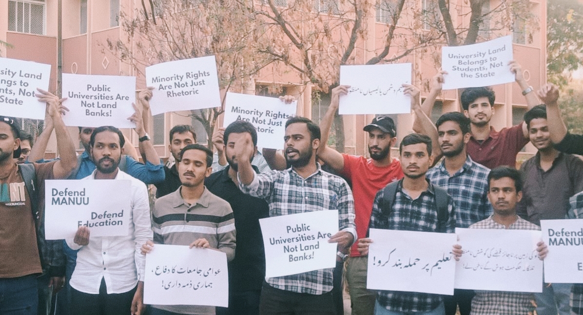 ایم اے این یو یو کے طلبہ کا 50 ایکڑ اراضی واپس لینے کی مبینہ کوشش کے خلاف احتجاج