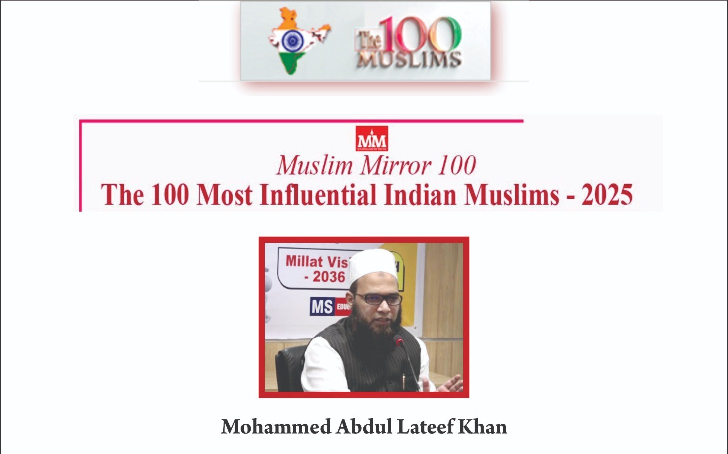یہ باوقار فہرست معروف آزاد اور غیر منافع بخش نیوز پلیٹ فارم مسلم مرر کی جانب سے شائع کی گئی ہے، جس میں ملک کے 100 سرکردہ مسلم قائدین، سماجی مصلحین اور وژنری شخصیات کو خراجِ تحسین پیش کیا جاتا ہے۔