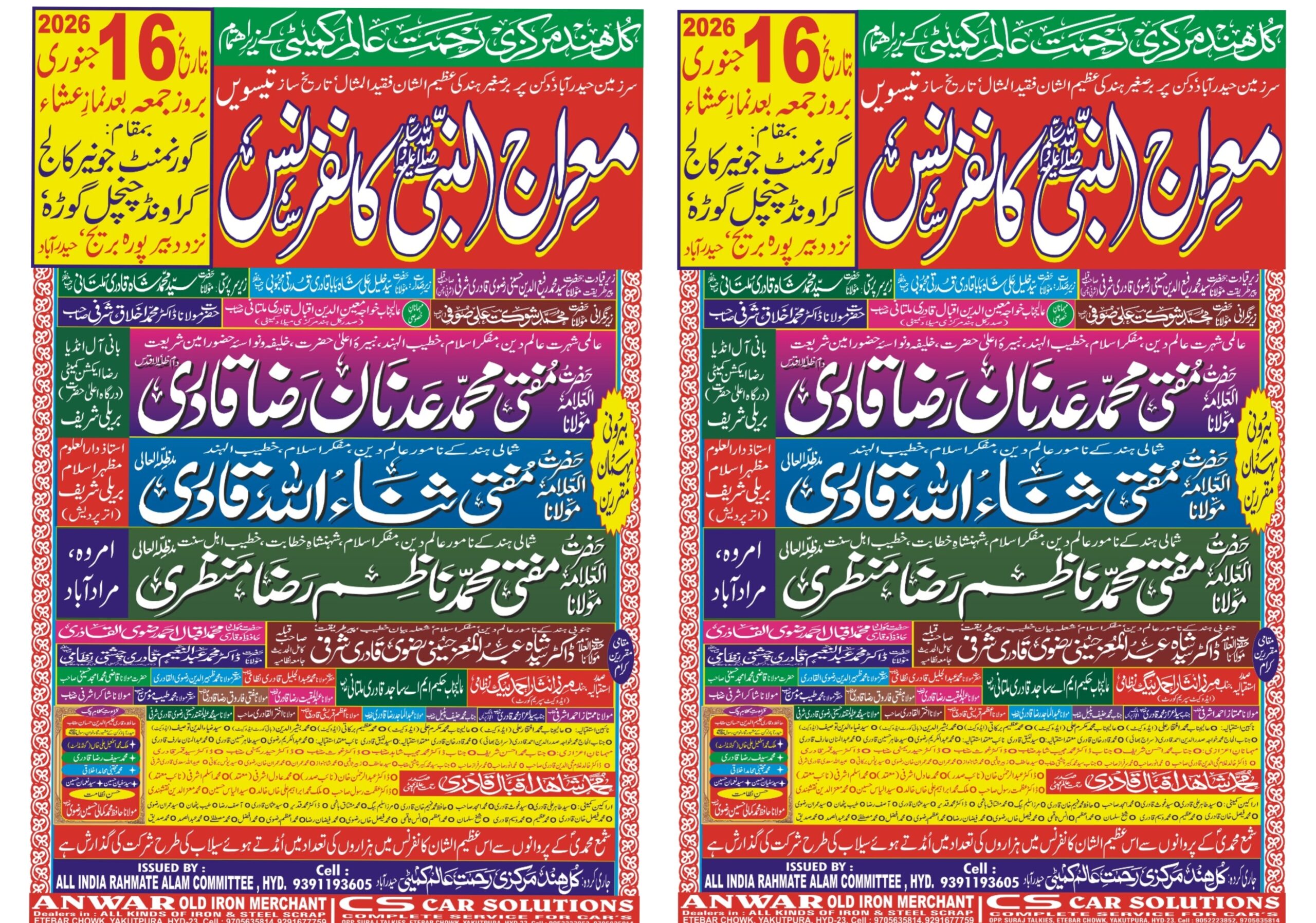 کل ہند مرکزی رحمت عالم کمیٹی کی 16/جنوری کوچنچل گوڑہ جونیر کالج گراونڈ پر عظیم الشان تیسویں معراج النبی ؐکانفرنس