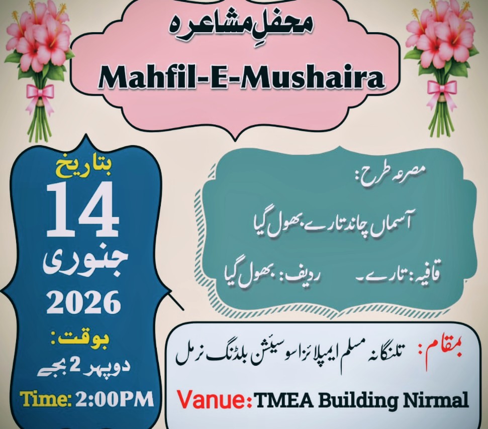 انشاءاللہ مشاعرہ بروز چہار شنبہ بتاریخ 14 جنوری 2026 بوقت دوپہر 2 بجے بمقام تلنگانہ مسلم ایمپلائز اسوسیئشن بلڈنگ نرمل منعقد ہوگا۔
