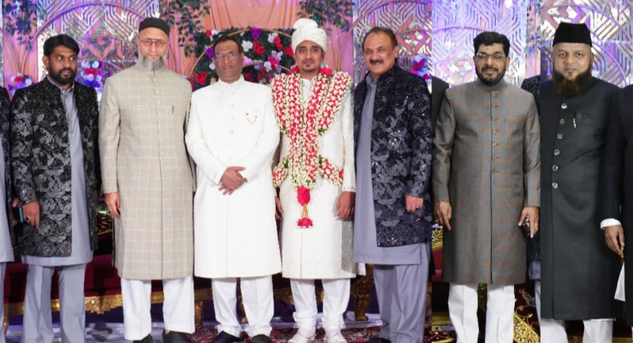 جناب خواجہ فرید الدین کی دختر کا عقد نکاح جناب سید افتخار احمد قونصلیٹ جنرل آف انڈیا (جدہ) کے فرزند ڈاکٹر سید فاروق افتخار احمد سے لنکس کراؤن کنونش میں انجام پایا۔ تصویر میں جناب بیرسٹر اسد الدین اویسی صدر مجلس اتحاد المسلمین و ایم بی حیدر آباد فہم قریشی صدر تی ایم آرامی آئی ایس، جعفر حسین معراج ایم ایل اے خواجہ فخر الدین سینئر کانگریس لیڈر را شد فراز الدین کارپوریٹر شیخ پیٹ اکبر خان اکبر ٹور اس ترویتی، حافظ محمد فیاض علی میجنگ ڈائرکٹر المیز ان ٹورس اینڈ ٹراویلیس، حامد فیاض الدین جاوید فریس الدین (رومیسا) برہان الدین است گیری و قار آباد کے علاوہ عزیز واقارب دوست و احباب کی کثیر تعداد نے شرکت کرتے ہوئے عروس و عروسہ کو مبارکباد پیش کرتے ہوئے ہو نیک تمناؤں کا اظہار کیا۔