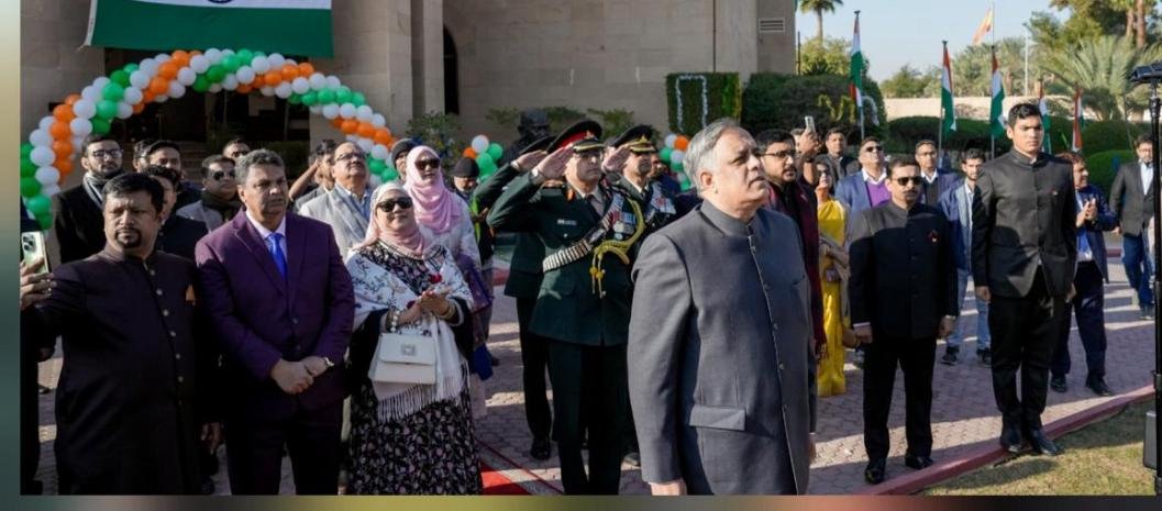 ہندوستان کا 77 واں یوم جمہوریہ سفارت خانہ ہند ریاض میں روایتی جوش و خروش سے منایا گیا۔ سنکڑوں ہندوستانیون کی موجودگی میں سفیر ہند برائے سعودی عرب ڈاکڑ سہیل اعجاز خان نے قومی ترنگا لہراکر اس رنگارنگ تقریب کا آغاز کیا۔ اس موقع پر بڑی تعداد میں ہندوستانی کمیٹی کے مرد و خواتین، پرواسی ایوارڈیز، دیگر سفارت کار اور ایمبیسی اسٹاف کی موجودگی نے تقریب کو مزید پر وقار و خوشگوار بنایا۔