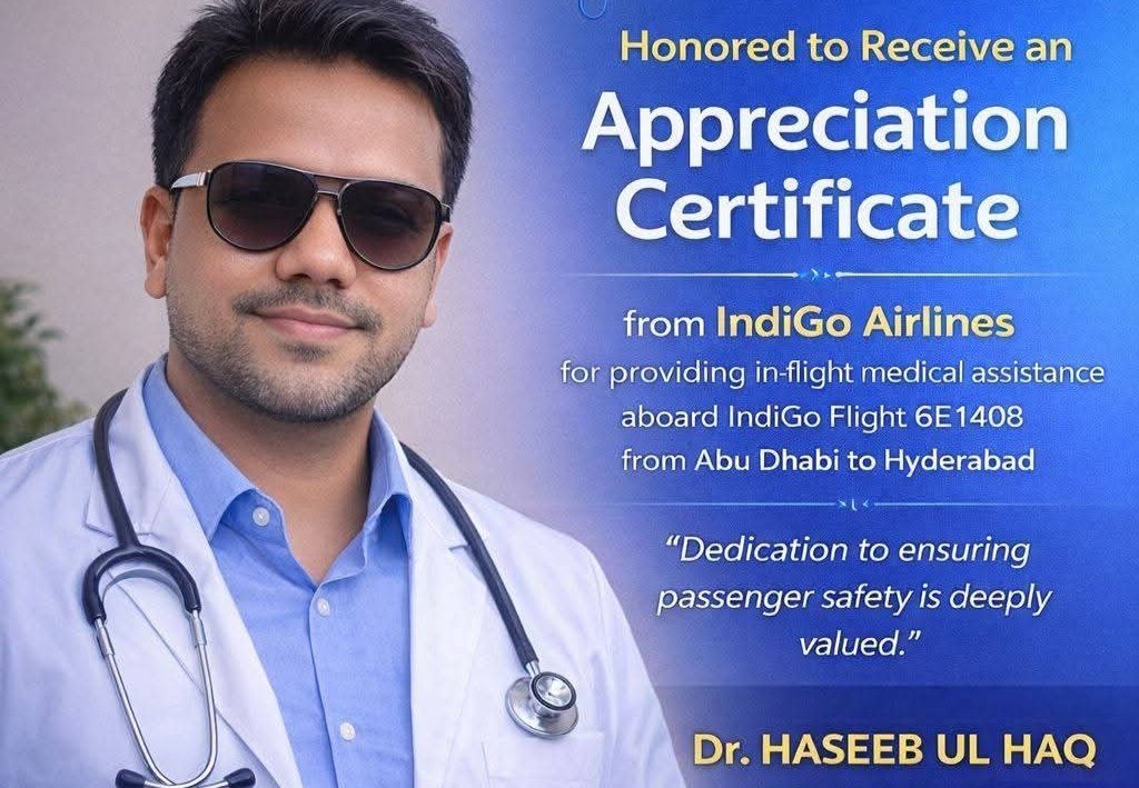 تلنگانہ کے کاغذ نگر ٹاؤن سے تعلق رکھنے والے نوجوان ڈاکٹر حسیب الحق نے انڈیگو ایئرلائن کی ایک پرواز کے دوران اپنی پیشہ ورانہ ذمہ داری کا شاندار مظاہرہ کرتے ہوئے ایک مسافر کی جان بچا لی۔ ڈاکٹر حسیب الحق دبئی سے ہندوستان آ رہے تھے کہ دورانِ پرواز اچانک ایک مسافر کی طبیعت شدید خراب ہو گئی۔