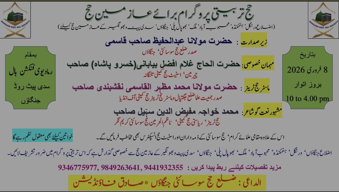 سیکریٹری ضلع حج سوسائٹی جنگاؤں محمد خواجہ مجتہدالدین کی اطلاع کے بموجب ضلع حج سوسائٹی کی جانب سے اور صادق فاؤنڈیشن کے حسن تعاون سے جنگاؤں میں ایک روزہ حج تربیتی پروگرام برائے عازمین حج بروز اتوار بتاریخ 8 فبروری بمقام رما دیوی فنکشن ہال سدی پیٹ روڈ جنگاؤں میں منعقد کیا جا رہا ہے