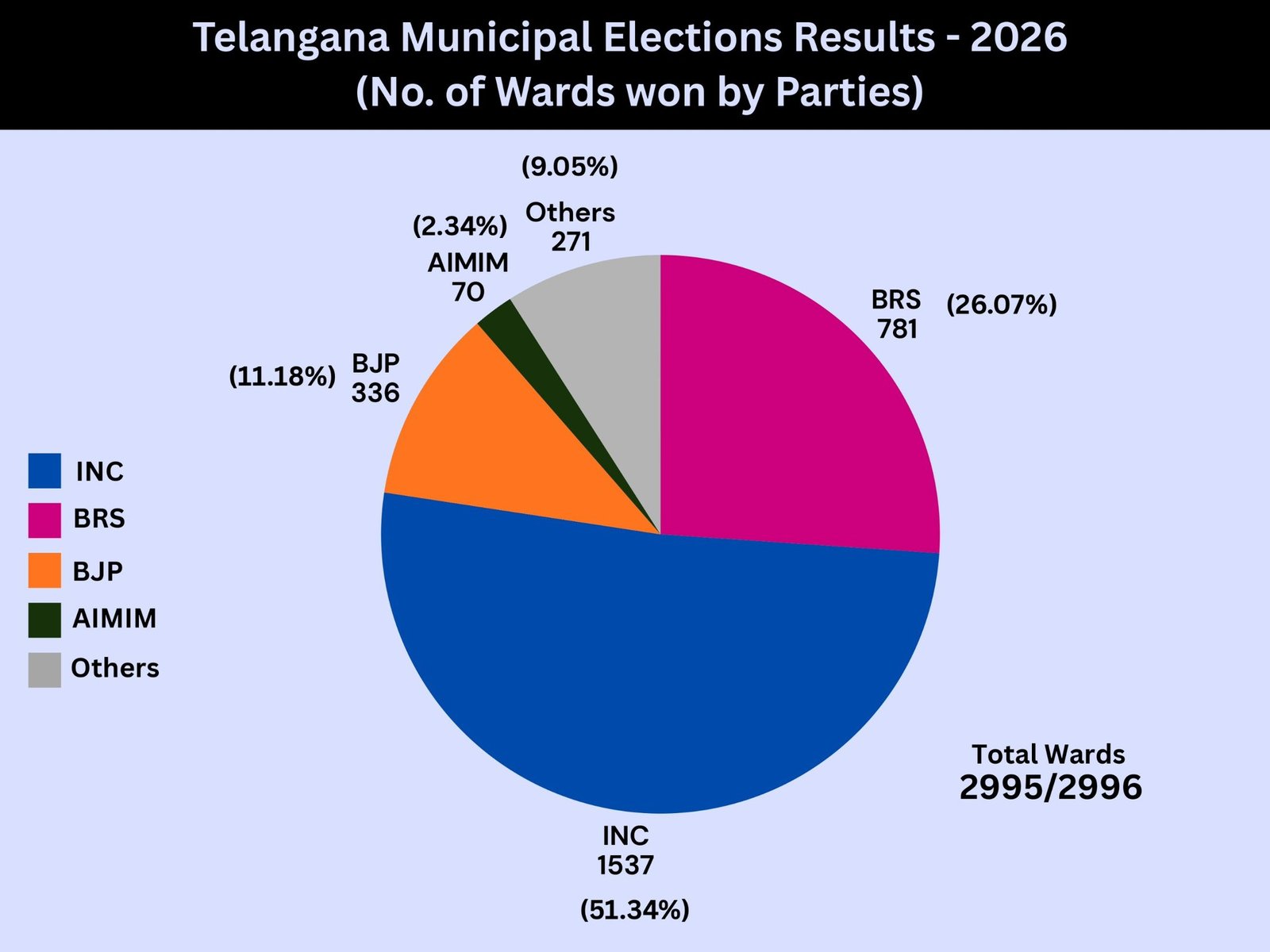 تلنگانہ میں بلدی انتخابات کے فائنل نتائج کا سرکاری اعلان وارڈس اور ڈیویژنس کے اعتبار سے جاری کر دیا گیا ہے۔ریاست بھر میں کانگریس نے سبقت حاصل کرتے ہوئے 1537 نشستیں (51.34 فیصد) اپنے نام کیں، جبکہ بی آر ایس کو 781 نشستیں (26.07 فیصد) حاصل ہوئیں۔ اسی طرح بی جے پی نے 336 نشستوں (11.18 فیصد) پر کامیابی درج کی