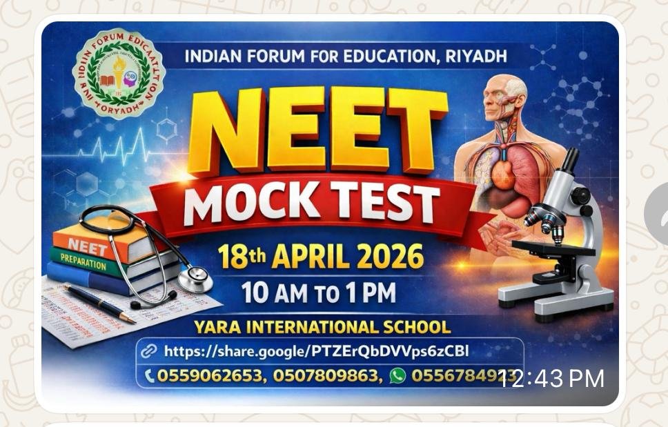 حسب سابق انڈین فورم فار ایجوکیشن (IFE) کے تحت امسال بھی NEET Mock Test کا انعقاد عمل میں آئے گا۔ فورم کی جانب سے جاری پریس نوٹ کے مطابق یہ امتحان 18 اپریل 2026 کو یارا انٹرنیشنل اسکول ریاض میں منعقد ہوگا۔ریاض میں مقیم تمام طلباء و طالبات اس امتحان کے لیے اپنے نام رجسٹر کروا سکتے ہیں۔ رجسٹریشن کے لیے نیچے دئیے ہوئے لنک پر جائیں۔