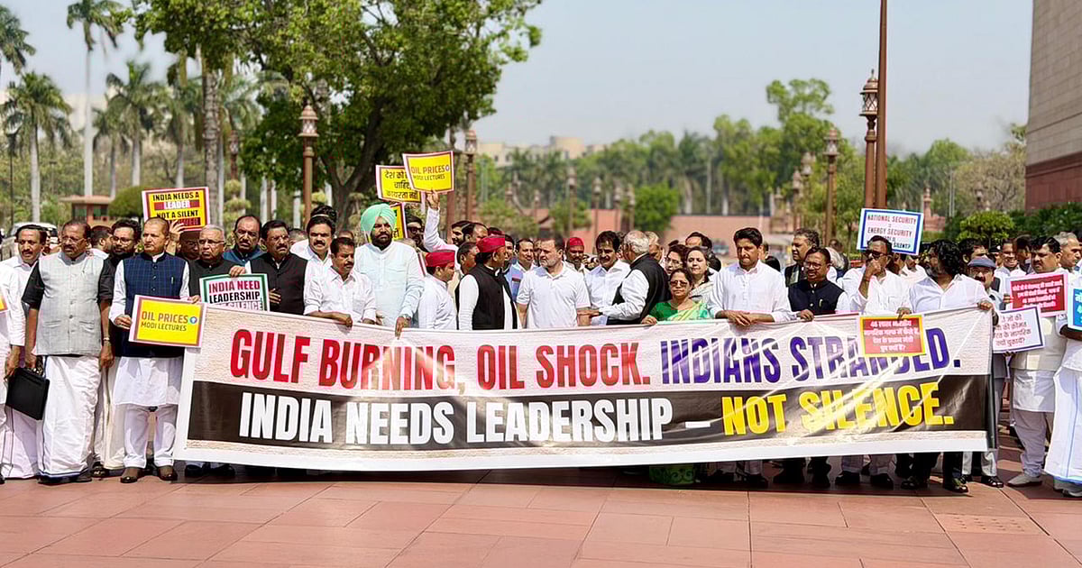 لوک سبھا میں اپوزیشن کے قائد راہل گاندھی اور راجیہ سبھا میں قائدِ حزبِ اختلاف ملکارجن کھڑگے سمیت کئی اپوزیشن اراکین پارلیمنٹ کے مکر دروازے پر جمع ہوئے۔ اپوزیشن اراکین ایک بڑا بینر اٹھائے ہوئے تھے جس پر مغربی ایشیا کی صورتحال پر حکومت سے وضاحت کا مطالبہ کیا گیا تھا۔