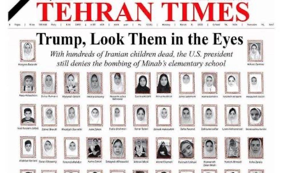 جنگ کے پہلے ہی دن ایران کے شہر میناب میں ایک اسکول پر ہوئے حملے میں 150 سے زائد بچیوں کے جاں بحق ہونے کی بات سامنے آئی تھی۔ تازہ طور پر پیر کے روز اخبار نے ان بچوں کی تصاویر اپنے پہلے صفحے پر شائع کیں۔اخبار نے پہلے صفحے پر بچوں کی تصاویر کے ساتھ یہ جملہ لکھا“ٹرمپ، ایک بار ان بچوں کی آنکھوں میں دیکھو۔”تہران ٹائمز نے اپنے ایکس (سوشل میڈیا) پوسٹ میں کہا کہ سینکڑوں ایرانی بچے امریکی حملوں میں مارے گئے
