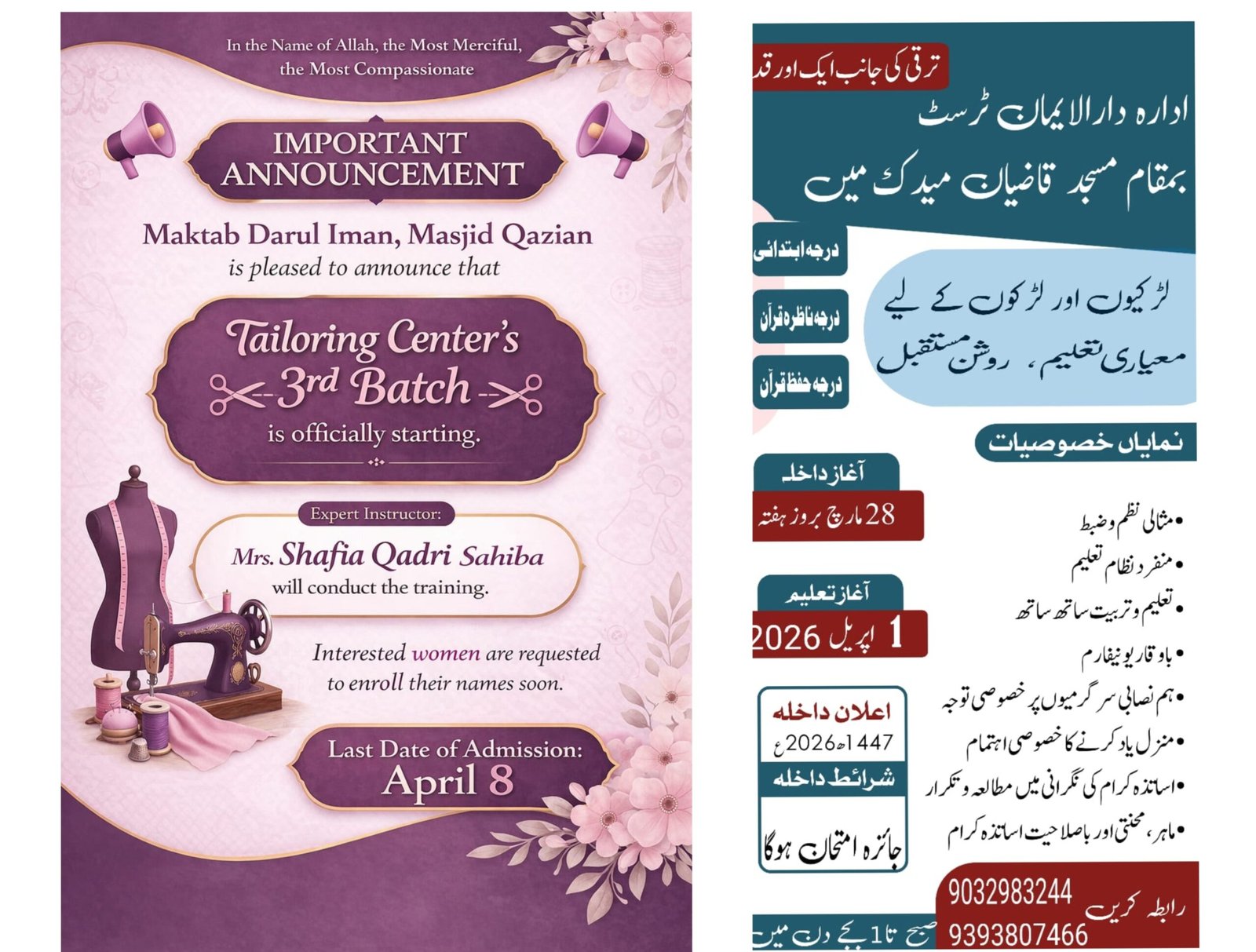 ادارے میں طلبہ و طالبات کے لیے ابتدائی درجے، ناظرہ قرآن اور حفظ قرآن کی کلاسز کا آغاز کیا جا رہا ہے، جہاں دینی تعلیم کے ساتھ ساتھ تربیت پر بھی خصوصی توجہ دی جائے گی۔