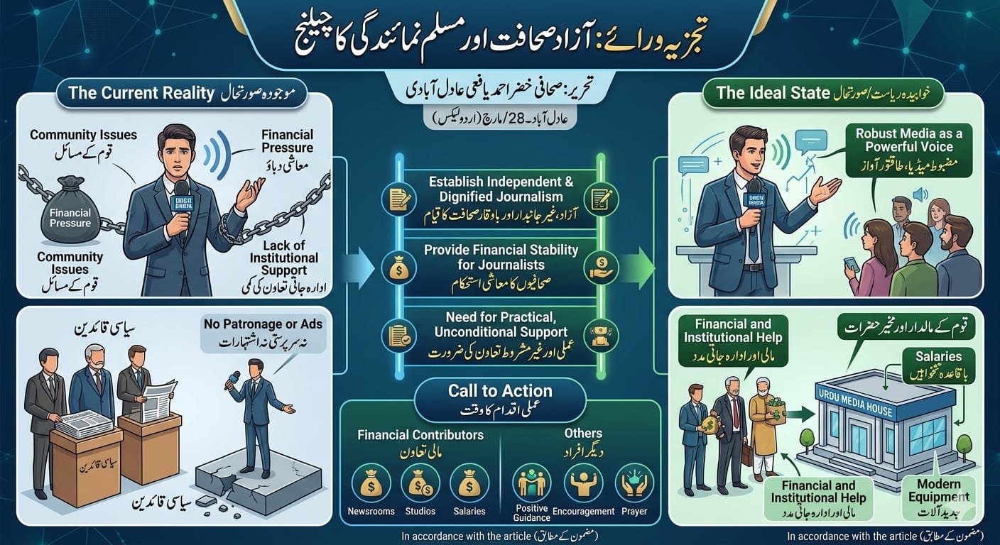 ایسے میں ضرورت اس بات کی ہے کہ قوم کے مالدار افراد، صنعت کار اور مخیر حضرات محض زبانی دعوؤں تک محدود نہ رہیں بلکہ عملی میدان میں آگے آئیں۔ بغیر کسی تشہیر یا احسان جتائے، اردو میڈیا کے لئے بنیادی سہولیات جیسے نیوز روم، اسٹوڈیو، جدید کیمرے، تکنیکی عملہ اور باقاعدہ تنخواہوں کا نظام قائم کریں۔ اس سے نہ صرف صحافی معاشی طور پر مستحکم ہوں گے بلکہ وہ بغیر کسی دباؤ کے پیشہ ورانہ ذمہ داریاں بہتر انداز میں ادا کر سکیں گے۔