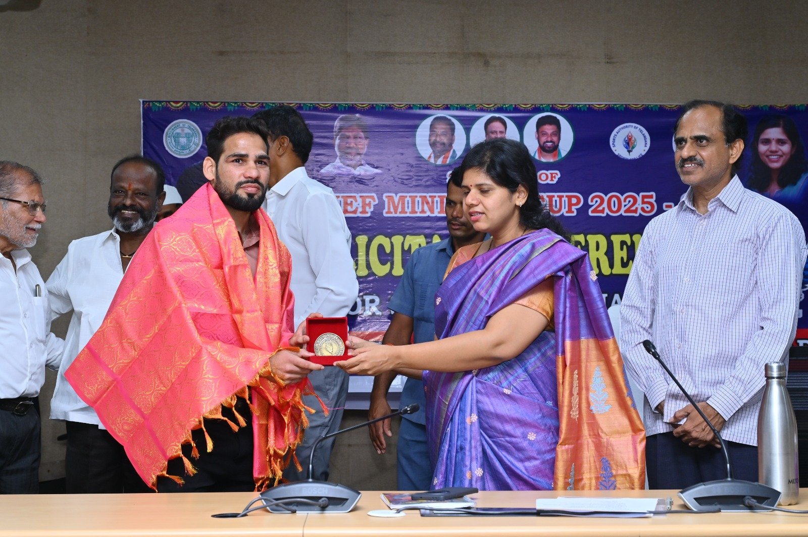 ۔ انہوں نے کہا کہ کھلاڑی انہیں تحریک کے طور پر لیں اور آگے پیشرفت کریں اور نظام آباد ضلع کے وقار میں مزید اضافہ کریں۔ انٹیگریٹڈ ڈسٹرکٹ آفس کمپلیکس میں چیف منسٹر کپ – 2025 کے کھیلوں کے مقابلے جیتنے والوں کے لیے ایک پروقار تقریب کا انعقاد کیا گیا، جس کا اہتمام ریاستی حکومت نے دیہی کھلاڑیوں کی حوصلہ افزائی کے مقصد سے کیا تھا۔ ضلع کلکٹر نے مختلف زمروں میں تمغے جیتنے والے کھلاڑیوں کو مبارکباد دی اور انہیں تمغے، انعامات اور تعریفی اسناد سے نوازا۔بین الاقوامی باکسر اور ارجن ایوارڈ یافتہ حسام الدین اور ہندوستانی فٹ بال ٹیم کے کپتان گگولوتھ سومیا، دونوں ضلع نظام آباد کے رہنے والے، اس تقریب کے مہمان خصوصی تھے اور ڈسٹرکٹ کلکٹر ایلا ترپاٹھی نے ان کا خیر مقدم کیا