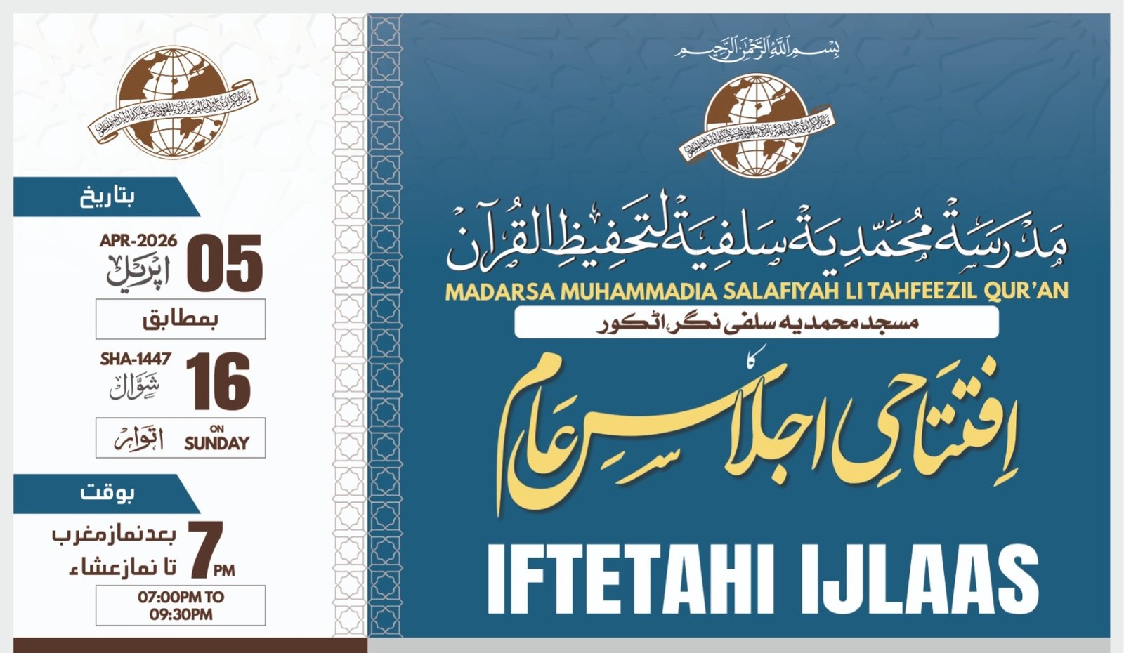 اٹکور: عالی جناب سیف اللہ خان نائب امیر ضلعی جمیعت اہل حدیث کی اطلاع کے بموجب مقامی دینی تعلیمی ادارے مدارسہ محمدیہ سلفیہ لتحفیظ القرآن، مسجد محمدیہ سلفی نگر، اوٹکور کے زیر اہتمام ایک عظیم الشان “افتتاحی اجلاس عام” کا انعقاد کیا جا رہا ہے۔ یہ مبارک تقریب بروز اتوار، بتاریخ 05 اپریل 2026 (مطابق 16 شوال المکرم 1447ھ) بعد نماز مغرب تا عشاء مسجد کے صحن میں منعقد ہوگی۔