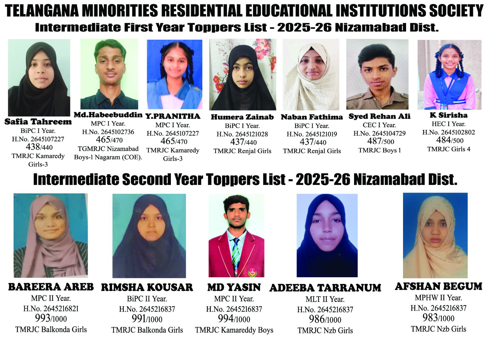 ریاستی سطح پر انٹرمیڈیٹ سال اول ایم پی سی محمد حبیب الدین جے سی ناگارام نظام آباد، بی پال سنگھ بوائز کاماریڈی اور وائی پراتنا گرلز 3 نظام آباد نے 465/440 نشانات حاصل کئے جبکہ صفاء تحریم بی پی سی گرلز کاماریڈی نے 438/440 نشانات حاصل کرکے ریاستی سطح پر سرفہرست رہی۔ علاوہ ازیں نبان فاطمہ، حمیرہ زینب گرلز رنجل اور کے ساتھویک بوائز کاماریڈی نے 437/440 نشانات کے ساتھ کامیابی حاصل کی۔ جبکہ سال دوم میں گرلز بالکنڈہ کی طالبہ بسریرہ اریب 993/1000 ریاستی سطح پر نمایاں مقام حاصل کیا اور بی پی سی سال دوم محمد یٰسین بوائز کاماریڈی 994/1000 اور ریشما کوثر گرلز بالکنڈہ نے 991/1000 نشانات حاصل کئے۔ محمد عبدالبصیر ریجنل لیول کوآرڈنیٹر ٹمریز نظام آباد نے طلباء کو مبارکباد دیتے ہوئے کہا کہ ٹمریز تعلیمی اداروں نظام آباد کا انٹرمیڈیٹ سال اول مجموعی نتیجہ 80% فیصد اور سال دوم کا مجموعی نتیجہ 90% فیصد رہا۔