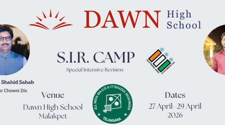 حیدر آباد۔ کل ہند مجلس اتحادالمسلمین کے تعاون سے ڈان ہائی اسکول ملک پیٹ میں 27 تا 29 اپریل صبح 9 تا 4 بجے شام ایس آئی آر کیمپ منعقد کیا جا رہا ہے ۔
