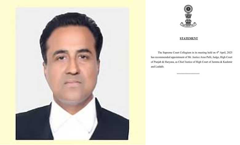 نئی دہلی (پی ٹی آئی) سپریم کورٹ کالجیم نے پنجاب و ہریانہ ہائی کورٹ کے جج جسٹس ارون پلی کو جموں و کشمیر و لداخ کا چیف جسٹس بنانے کی سفارش کی ہے۔