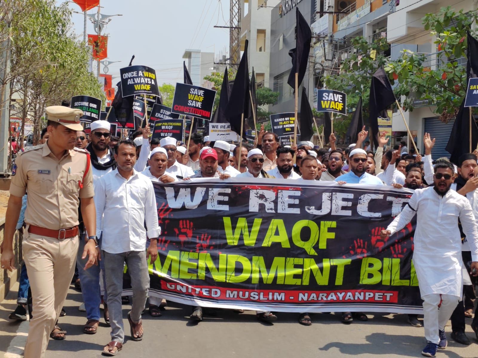 نارائن پیٹ : 08 اپریل (اُردو لیکس) تلنگانہ کے نارائن پیٹ میں آج بروز منگل صبح کل جماعتی مسلم قائدین کی جانب سے وقف ترمیمی بل کے خلاف زبردست احتجاجی ریالی نکالی گئی ۔ ریالی کا آغاز مرکزی جامع مسجد سے کیا گیا جو شہر کے مختلف شاہراہوں و چوراہوں سے ہوتے ہوئے آر ڈی او آفس پہنچ کر آر ڈی او کو ایک میمورنڈم دیا گیا۔