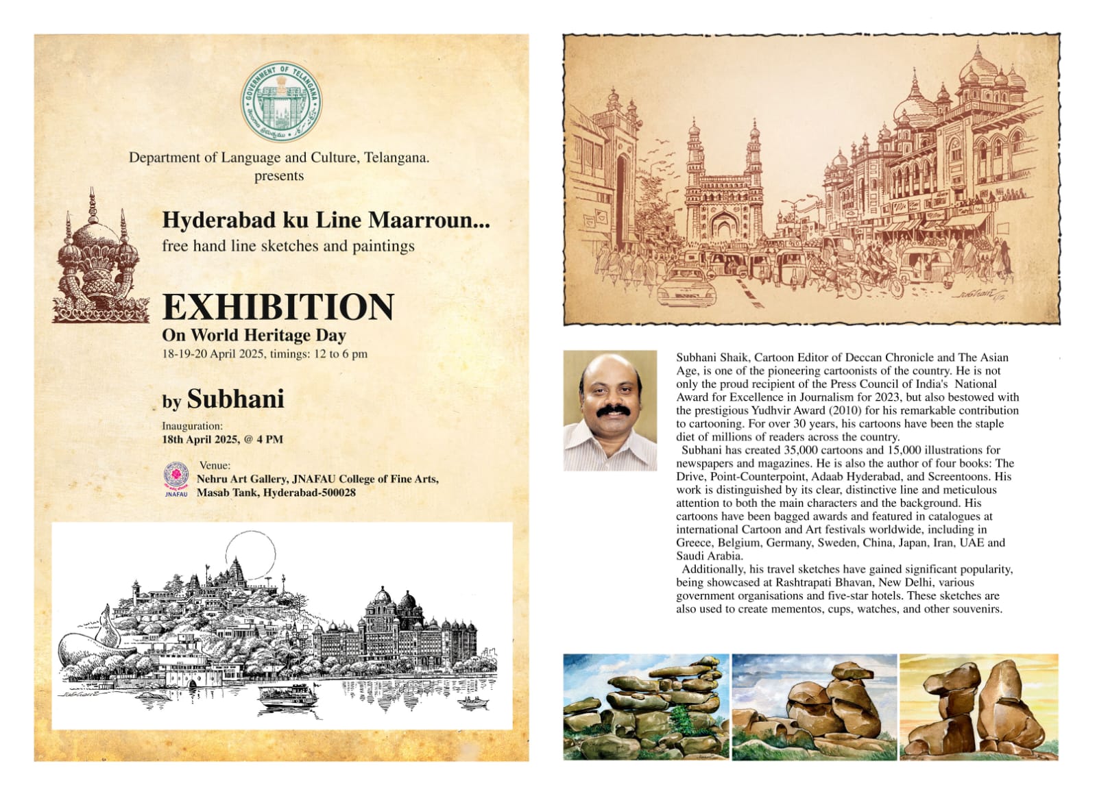 حیدرآباد: محکمہ ثقافت تلنگانہ کے زیر اہتمام ” ورلڈ ہیریٹیج ڈے” کے موقع پر ایک منفرد فن پاروں کی نمائش کا اہتمام کیا جا رہا ہے۔ “حیدرآباد کو لائن مارروں…” کے زیر عنوان منعقد شدنی اس نمائش میں مشہور کارٹونسٹ شیخ سبحانی کے ہاتھ سے تیار کردہ فری ہینڈ اسکیچس اور تصویری فن پارے پیش کیے جائیں گے۔