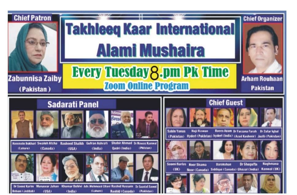 تخلیق کار انٹرنیشنل کے عالمی مشاعرہ میں 60 سے زائد شعراء کی شرکت۔ زیب النساء زیبی کی سرپرستی میں عالمی سطح پر ادبی مشاعرہ کا انعقاد۔ اس عالمی مشاعرے میں اردو ادب کی مایہ ناز شخصیات نے شرکت کی۔