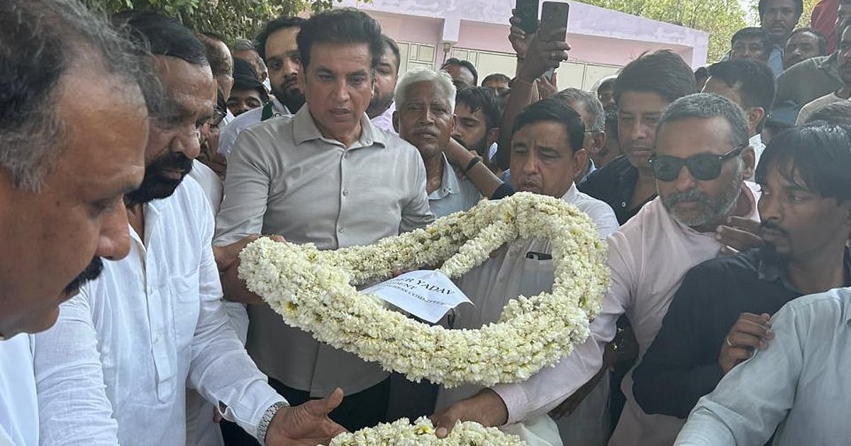 جئے کشن کے جسد خاکی پر پھولوں کی ریتھ پیش کرتے ہوئے دیویندر یادو