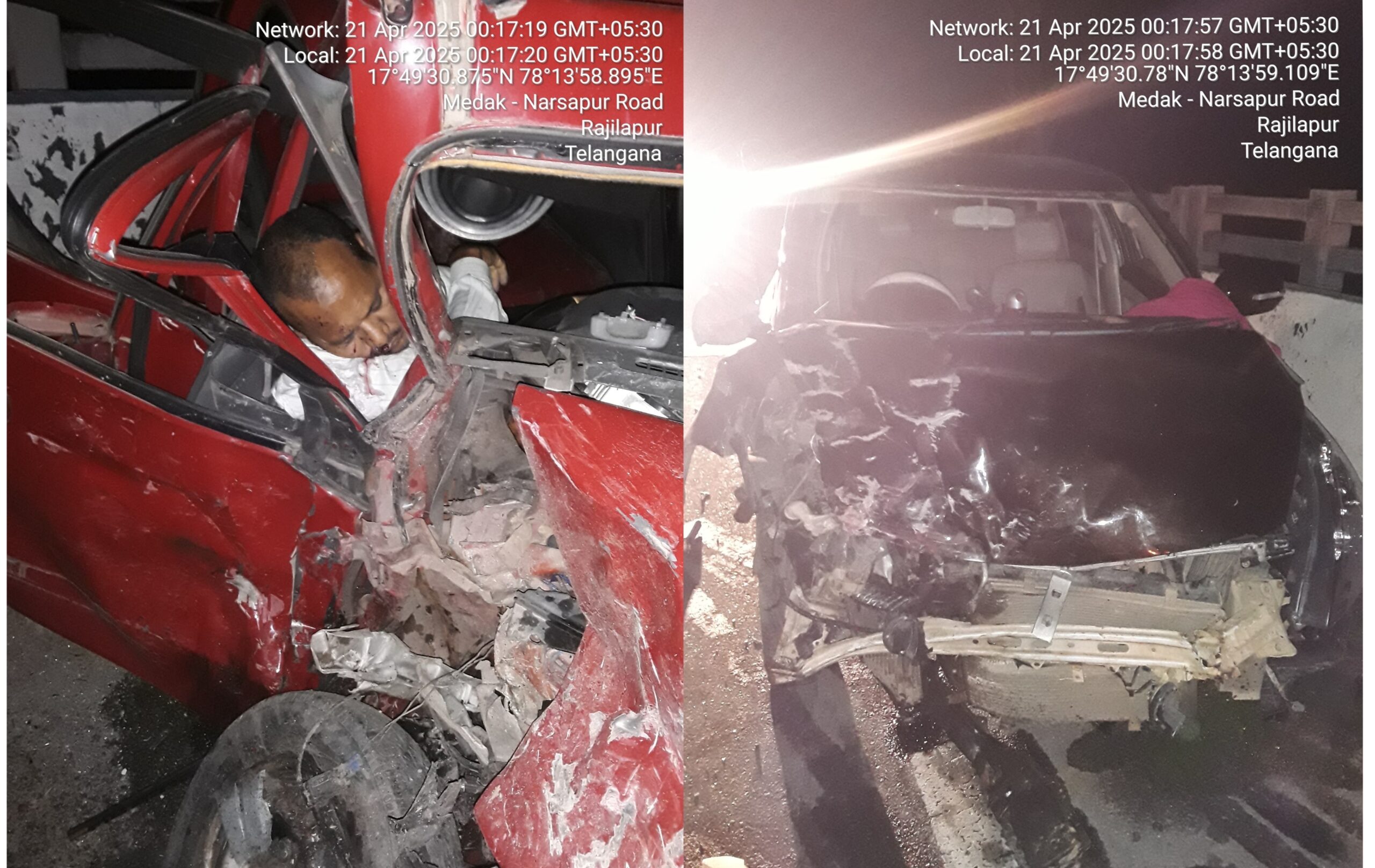 اتوار کی ادھی رات تیز رفتاری سے جا رہی دو کاریں ایک دوسرے سے زوردار ٹکرا گئیں۔ اس حادثے میں دونوں کار میں سوار تین افراد موقع پر ہی جاں بحق ہو گئے اور 7 دیگر زخمی ہوگئے ۔ یہ واقعہ کوڈی پلی منڈل کے وینکٹ راؤ پیٹ گیٹ کے قریب پیش آیا۔