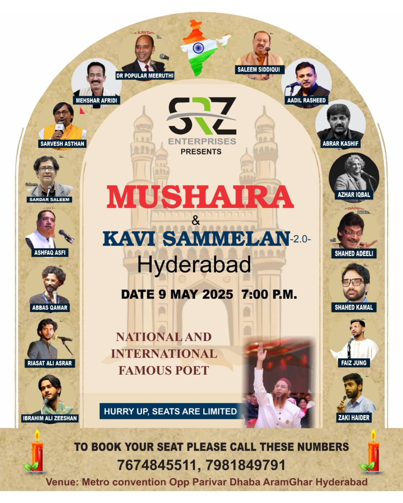 حیدرآباد ۔گزشتہ سال کی زبردست کامیابی کے بعد، صدر قاری محمد عبدالرّحمٰن کی سرپرستی میں دوسرا SRZ مشاعرہ و کوی سمیلن منعقد کیا جا رہا ہے،تاریخ: 9 مئی 2025، شام 7 بجےمقام: میٹرو کنونشن، آرام گھر، حیدرآباد۔