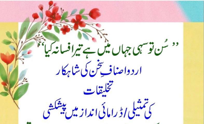 انجمن ریختہ گویان حیدرآباد کے زیر اہتمام “سن توسہی جہاں مین ہے تیرا فسانہ کیا” کے عنوان سے اردو اصناف سخن کی شاہکار تخلیقات کی تمثیلی/ ڈرامائی انداز میں پیشکشی عمل میں آئے گی۔