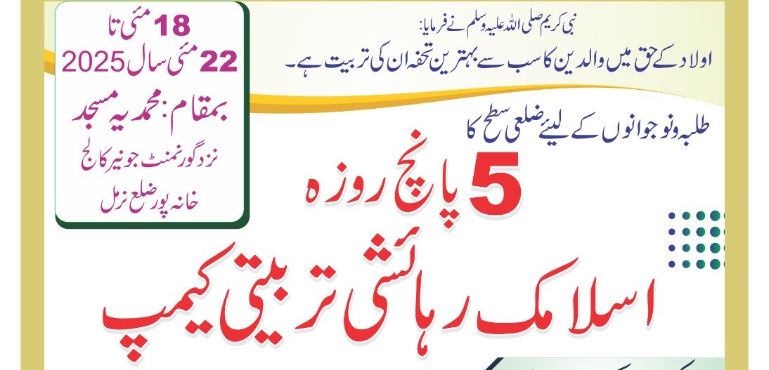 خانہ پور۔جماعت اسلامی ہند ضلع نرمل کی جانب سے طلبہ و نوجوانوں کے لئے ضلع سطح کا پانچ روزہ اسلامک رہائشی تربیتی کیمپ بتاریخ 18/مئ تا 22/مئ بمقام محمدیہ مسجد خانہ پور منعقد کیا جارہا ہے۔ اس رہائشی تربیتی کیمپ میں قرآن و ایمانیات کی تعلیمات میں طلبہ و نوجوانوں کے لئے ماہرین کی نگرانی میں تربیت کا نظم رہے گا ، سیرت النبی صلی اللہ علیہ وسلم اور تاریخ اسلام سے واقف کروایا جائے گا ، طلبہ و نوجوانوں میں شخصی ارتقاء اور تخلیقی صلاحیتوں کو پروان چڑھایا جائے گا