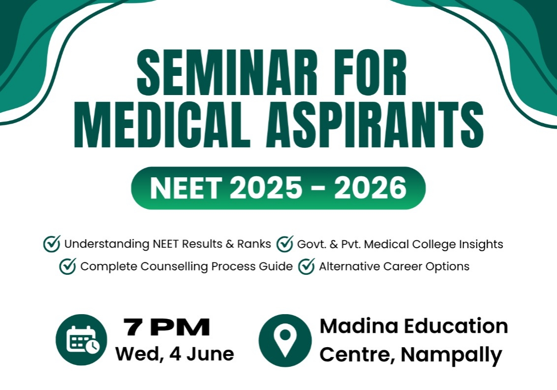 چہارشنبہ 4 جون کو مدینہ ایجوکیشن سنٹر نامپلی حیدرآباد میں نیٹ کے طلبا کے لیے خصوصی رہنمائی سیمینار