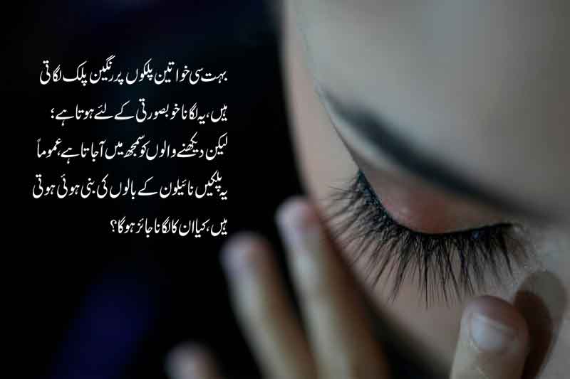 سوال:- بہت سی خواتین پلکوں پر رنگین پلک لگاتی ہیں، یہ لگانا خوبصورتی کے لئے ہوتا ہے ؛ لیکن دیکھنے والوں کو سمجھ میں آجاتا ہے ، عموماً یہ پلکیں نائیلون کے بالوں کی بنی ہوئی ہوتی ہیں ، کیا ان کا لگانا جائز ہوگا ؟ (فارحہ تسنیم، ایل بی نگر)