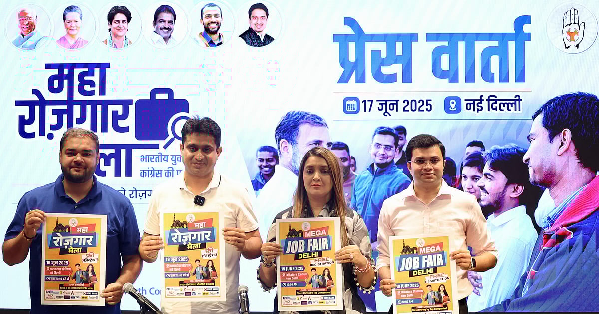 پریس کانفرنس میں ’روزگار میلہ‘ کا پوسٹر جاری کرتے ہوئے یوتھ کانگریس کے لیڈران