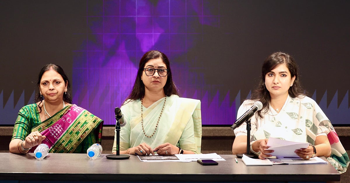 (دائیں سے بائیں) صوفیہ فردوس، الکا لامبا اور میناکشی باہنی پتی پریس کانفرنس کرتے ہوئے