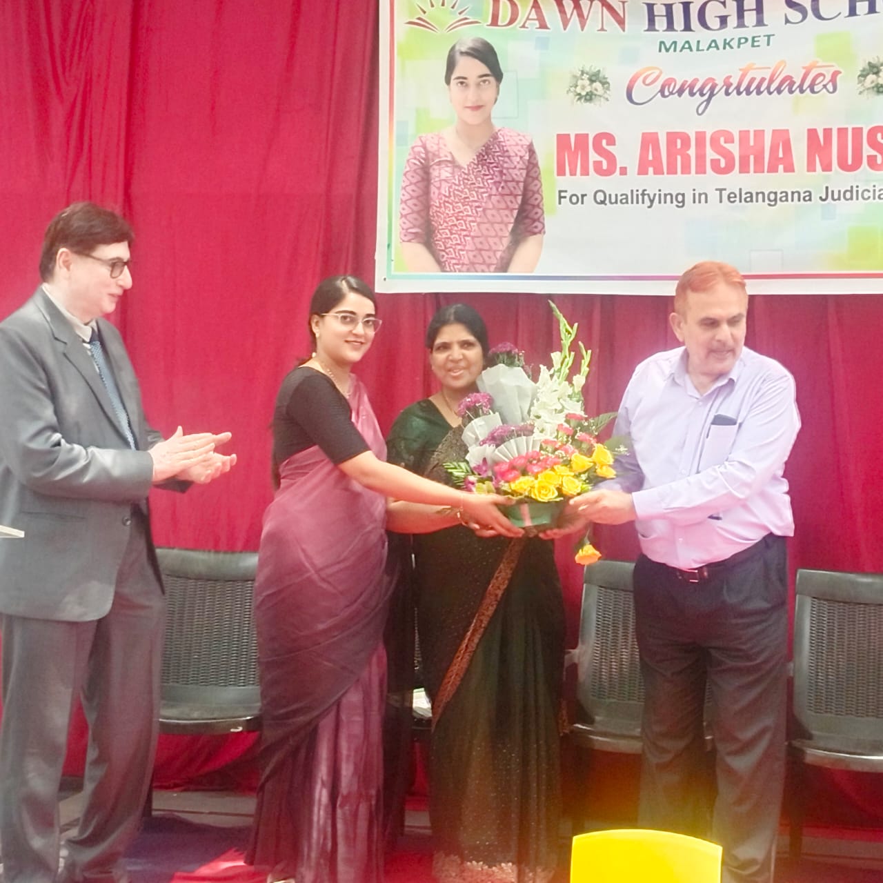 جناب فضل الرحمن خرم ڈائرکٹر ڈان ہائی اسکول کی صدارت میں منعقدہ اس تقریب میں عریشہ نصرت کی خوش دامن صاحبہ شاہین فاطمہ کے علاوہ جناب منظور احمد ، جناب امتیاز صدیقی شہ نشین پر موجود تھے۔ عریشہ نصرت نے طالبات سے خطاب کرتے ہوئے کہا کہ ڈاکٹر اور انجینئر بننے کا رجحان عام ہے، جبکہ وکالت پر کم توجہ دی جارہی ہے۔ حالانکہ یہ ایک ایسا شعبہ ہے جس کی سماج کے ہر فرد کو ضرورت ہے۔ عام طور پر یہ باور کرواکر اس پیشہ سے وابستہ ہونے سے روکا جاتا ہے کہ اس میں زیادہ تر جھوٹ بولنا پڑتا ہے جو بالکل غلط ہے۔ عریشہ نصرت جن کے شوہر محمد اسد اللہ شریف جونیئر سول جج اور سسر محمد عبد اللہ شریف ریٹائرڈ ڈسٹرکٹ جج ہیں