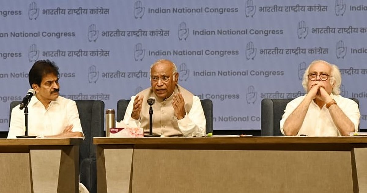 پریس کانفرنس کرتے ہوئے کانگریس صدر ملکارجن کھڑگے (درمیان میں)، تصویر قومی آواز/ویپن