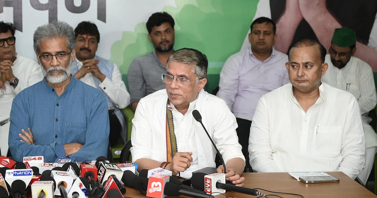پریس کانفرنس سے خطاب کرتے ہوئے کانگریس لیڈر پون کھیڑا (درمیان میں)، تصویر@INCBihar