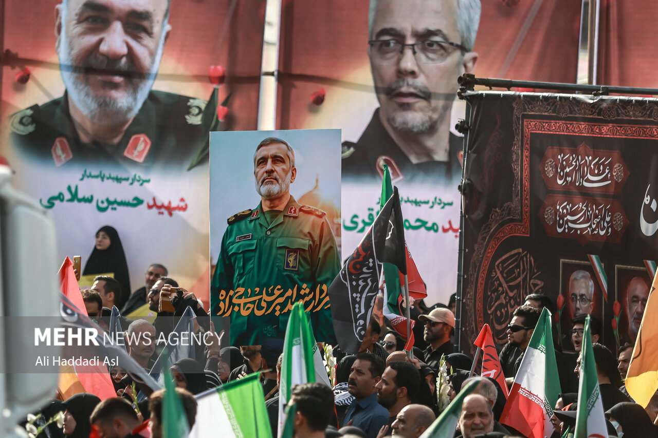 آج صبح دوبارہ بھشت زہرا میں تشییع جنازہ کا آغاز نماز جنازہ اور دعائیہ کلمات سے ہوا، جس میں ملک کی فوجی قیادت، شہداء کے اہل خانہ، مذہبی علما، حکومتی شخصیات اور ہزاروں سوگوار شہری شریک ہوئے۔ اس موقع پر بہشت زہرا کی فضا تکبیر، صلوات اور نعروں سے معمور رہی۔ شرکاء وقفے وقفے سے مردہ باد امریکہ اور مردہ باد اسرائیل کے نعرے لگا رہے تھے۔