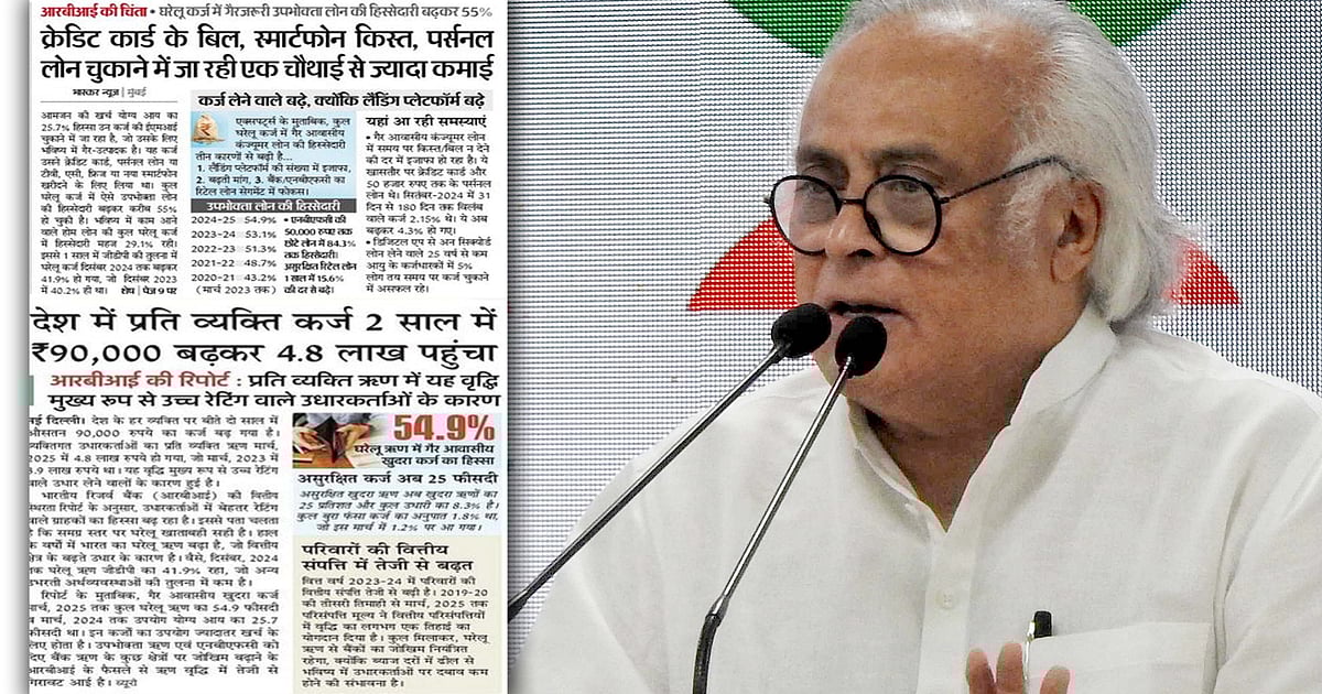 جے رام رمیش نے مزید کہا کہ موجودہ حالات میں لوگوں کی آمدنی کا 25.7 فیصد صرف پرسنل لون، کریڈٹ کارڈ بل اور موبائل قسطوں جیسی غیر پیداواری ادائیگیوں میں خرچ ہو رہا ہے۔ رپورٹ کے مطابق، کل گھریلو قرض کا 55 فیصد حصہ ایسے ہی غیر ضروری اخراجات پر لیا گیا قرض ہے، جو اس بات کا ثبوت ہے کہ عوام کی بنیادی آمدنی سے ان کا گزارہ ممکن نہیں رہا اور وہ قسطوں کے ذریعے زندگی چلا رہے ہیں۔