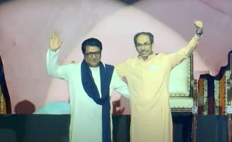 ممبئی: تقریباً 20 سال بعد دونوں بھائی اُدھو ٹھاکرے اور راج ٹھاکرے پہلی بار ایک ہی اسٹیج پر نظر آئے۔اور ایک دوسرے سے ملاقات کی ۔مہاراشٹرا میں “تین زبانوں کی پالیسی” کو منسوخ کرنے کے ریاستی کابینہ کے فیصلے کو اپوزیشن کی کامیابی قرار دیتے ہوئے ممبئی میں ’وائس آف مراٹھی‘ کے عنوان سے ایک پروگرام منعقد کیا گیا
